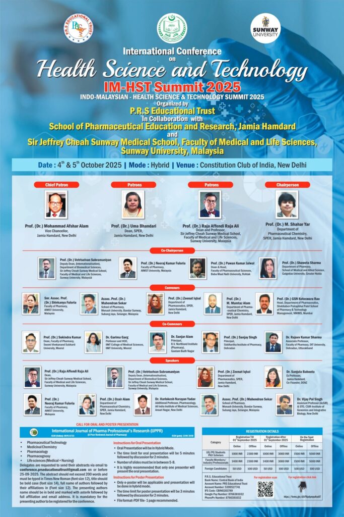 P.R.S Educational Trust successfully organized the International Conference on Health Science and Technology (IM-HST Summit 2025) in collaboration with the School of Pharmaceutical Education and Research, Jamia Hamdard, New Delhi, and Sir Jeffrey Cheah Sunway Medical School, Faculty of Medical and Life Sciences, Sunway University, Malaysia.